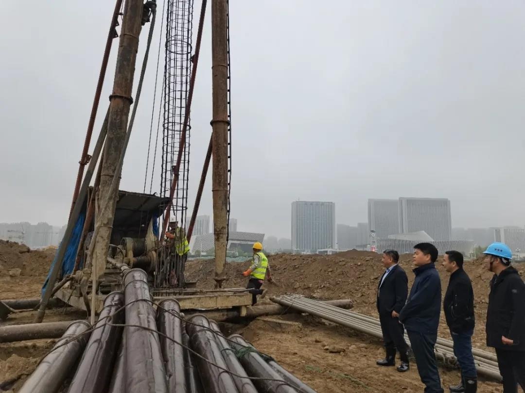 朱永兴一行对试桩工程施工、防尘网铺设、考古及清淤情形举行检查,,,,,,详细相识施工希望情形、保存问题等,,,,,,并对现园地块治理等事情提出意见建议。。。。。。。。
